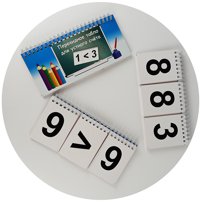 Также в состав пособия входят карточки с математическими знаками + – * : > = < и 2 обложки, выполненные из картона.